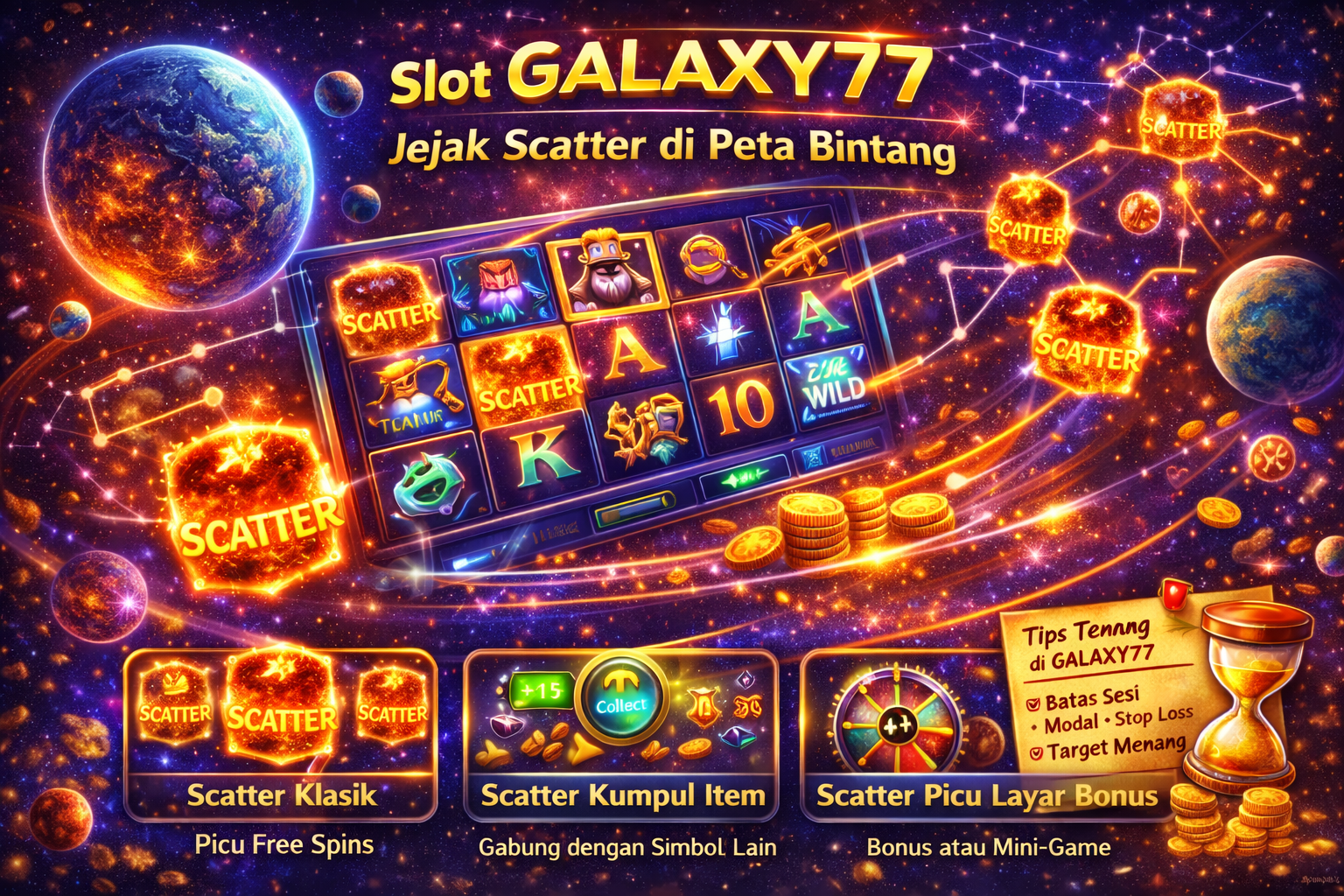 Di slot bertema luar angkasa seperti GALAXY77, simbol Scatter sering terasa seperti “titik-titik cahaya” yang muncul acak di layar—mirip bintang yang membentuk rasi. Kadang ia hadir satu, lalu menghilang. Kadang muncul dua, lalu kamu merasa “tinggal satu lagi”. Momen seperti itu membuat Scatter seolah meninggalkan jejak di “peta bintang” permainan.